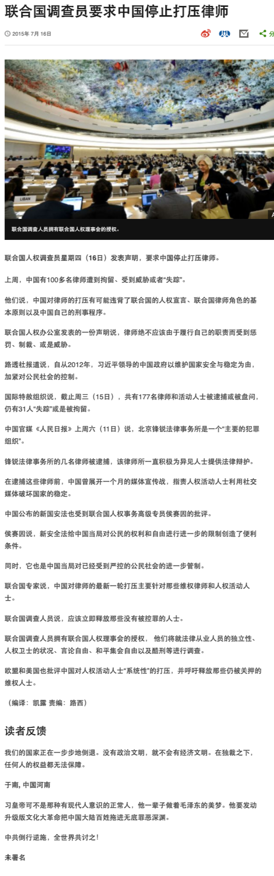Source: [UN investigators ask China to stop suppressing lawyers] (https://www.bbc.com/zhongwen/simp/world/2015/07/150716_china_un_human_rights)