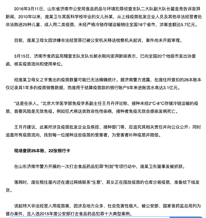On March 18, 2016, The Paper published an article “Hundreds of millions of yuan of vaccines flowed into 18 provinces without refrigeration: or affect human lives, Shandong Guangfa Association Investigation Letter”, the case occurred in Jinan, Shandong, involving a total of 570 million yuan, involving 25 illegal purchases Import and sale of Class II vaccines for adults and children