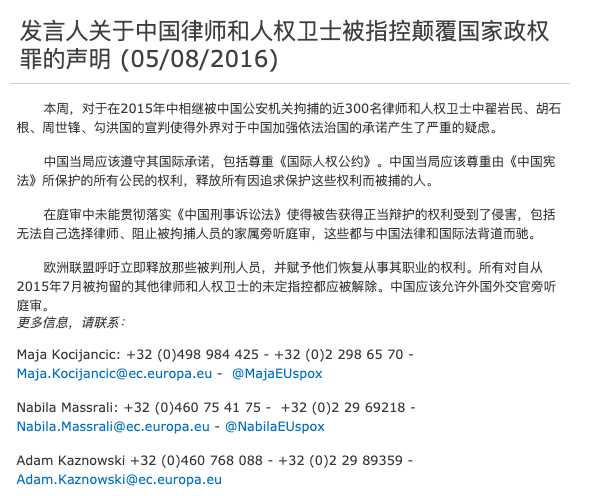 On August 5th, the EU Delegation to China published an article “The Spokesperson’s Statement on Chinese Lawyers and Human Rights Defenders Being Charged with Subversion of State Power”, stating that the CCP 709 began to arrest nearly 300 lawyers and human rights defenders, and sentenced them recently Several people “incited subversion of the country”, and the arrest process and the trial process violated the International Convention on Human Rights, the Chinese Constitution, the Chinese Criminal Procedure Law and other laws