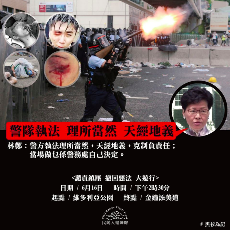 Source: [[Extradition Law] Carrie Lam insisted on Wednesday’s demonstration as a “riot”, supporting the police to violently suppress “Heaven and Earth Justice”] (https://hk.appledaily.com/local/20190615/LU3HD3S76ATMAQTWCG3QTU6AR4/)