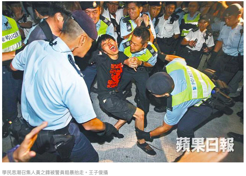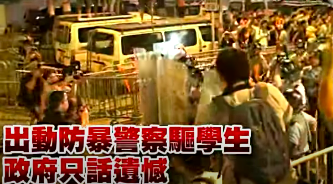On the fifth day of the student strike, 1,500 middle school students joined the rally and raided the Civic Square at night to occupy the flag-raising platform. The police used pepper spray and truncheons to arrest a number of students. The convener Huang Zhifeng (under 18) was brutally taken away by the police