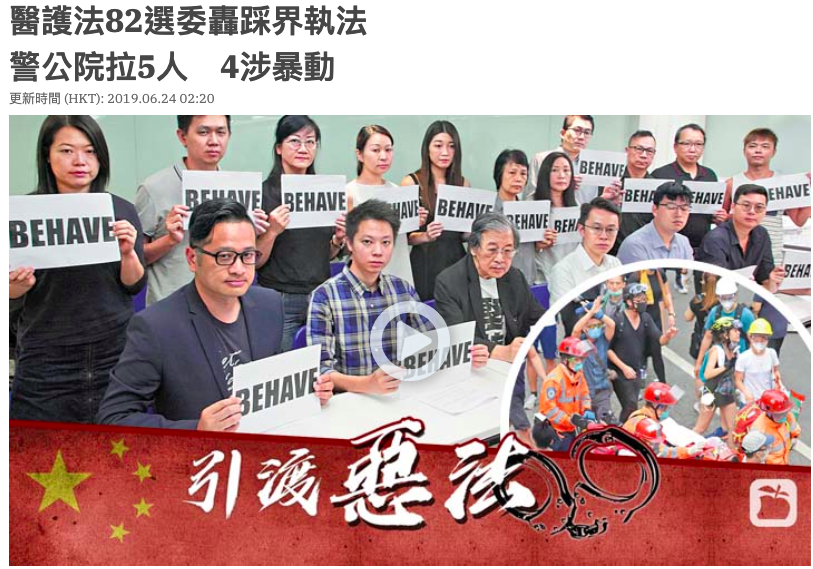Source: [Medical and Nursing Law 82 Election Committee slams and tramples on the border law enforcement police public house to pull 5 people and 4 riots] (https://hk.news.appledaily.com/local/20190624/A7FB45A5L5RUDNZUZTU4L2YNIU/)
