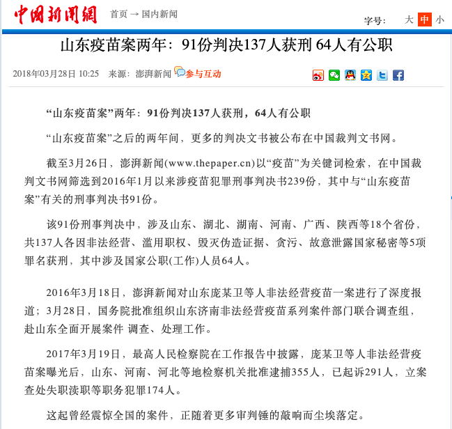 Original news: [Two years in the Shandong vaccine case: 91 sentences, 137 people sentenced, 64 people have public positions] (http://www.chinanews.com/gn/2018/03-28/8477844.shtml)