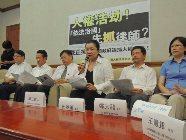 台湾声援中国人权律师网络等十余个台湾人权团体,周一紧急召开「人权浩劫!『依法治国』先抓律师?」记者会发表共同声明,抗议中国大规模逮捕维权律师,并呼 吁立刻放人!