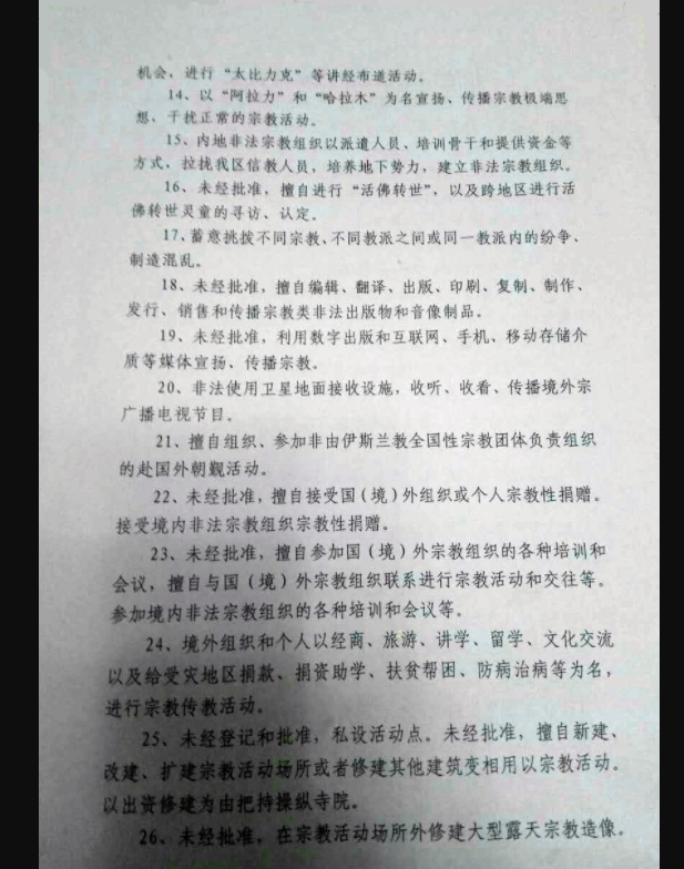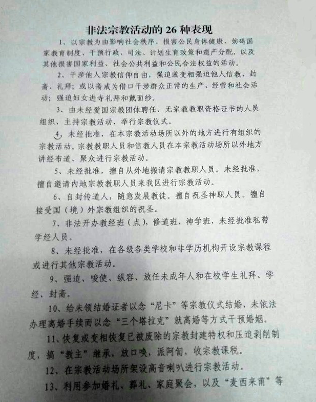 Source: [RFA Exclusive: Xinjiang Mandatory Implementation of 26 Illegal Religious Rules and Complete Ban on Unofficial Religious Activities] (https://www.rfa.org/mandarin/yataibaodao/shaoshuminzu/ql2-02282017104841.html)