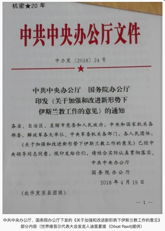 The “World Uyghur Congress” headquartered in Munich, Germany, announced to the media on June 22 part of the “CPC Central Office (2018) No. 24” document obtained by the organization. This confidential document, entitled "Opinions on Strengthening and Improving Islamic Work in the New Situation", was issued on April 19, requiring the party and government organs of all provinces, autonomous regions, and municipalities directly under the Central Government, the People’s Liberation Army and various departments of the Central Military Commission to contain and correct The “de-sinicization tendency” in the field of religion, to curb and actively and correctly guide the signs of desertification and Arabization in Islamic venues, clothing, religious etiquette, interpretation of classics, and the use of Arabic, and requires new and expanded Islam The venue highlights the "Chinese style". The “sandification” in the document refers to the basic doctrine dominating in Saudi Arabia, and the “Ahua” refers to the Arabization.